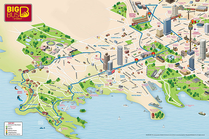 The Sydney Big Bus route includes 23 stops, including Kings Cross, Sydney Opera House, Botanical Gardens, Hyde Park, Power House Museum, Sydney Fish Markets, Maritime Museum, Sydney Aquarium, Chinatown, The Rocks and Circular Quay. The stops are currently:
